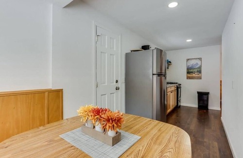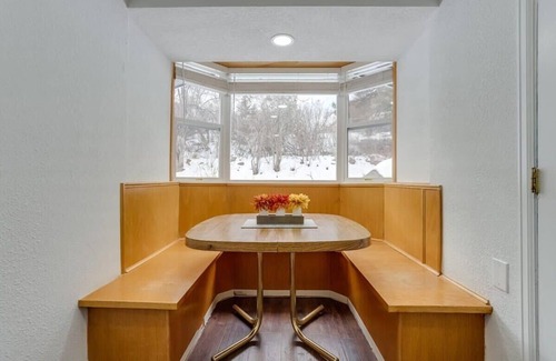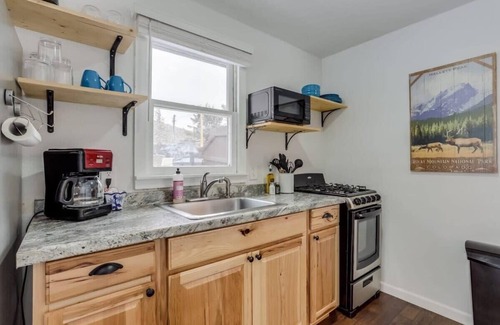 Walk from the main area to the kitchen where you will find a refrigerator, gas stove/oven, toaster, microwave, coffee and all the cookware and dishes you need! Enjoy a kitchen dining table set for four in our cozy nook with lots of sunlight. If you prefer to grill, you can walk out the back door to your own fenced in private patio and enjoy some grilling and fresh mountain air!