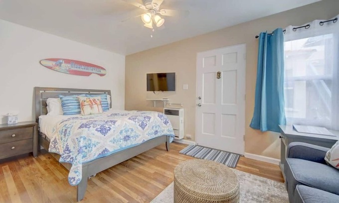 The ultimate San Diego destination for beach and paradise! Where it's always 5 o'clock! Located in Mission Beach just steps from the sand! Cross the street and you're at the beach! This adorable studio features a super comfy Queen bed, living space, and kitchen. Plus beach towels, beach chairs, sand toys, boogie boards and beach cruiser bikes supplied for cruising down the boardwalk! Outdoor shower for rinsing off. Plus window A/C is included, a rare luxury in this area!
