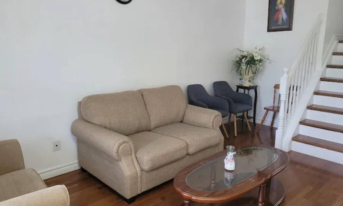 3 Bed room upstairs. Living area with a separate dinning space and kitchen at the main level. Laundry in the basement. Basement finished. Have the feeling of ironing your clothes at home with ironing facility at the basement. TV available with NETFLIX and ROKU. Basement washroom is not available for guests. Please be advised we do not provide towels for our guests due to hygiene concerns.