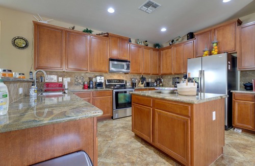 The ultimate desert getaway awaits at this beautiful 5-bedroom, 3.5-bath Maricopa home! Perfect for families or groups of friends, this vacation rental boasts a full kitchen, 2 cozy living spaces, and a private backyard oasis with tons of amenities to keep you occupied. Lounge by the outdoor pool, take a dip in the spa tub, or fire up the gas grill with loved ones. If you’re looking to venture out, make a splash at the Copper Sky Recreation Complex or test your luck at Harrah’s Ak-Chin Casino.