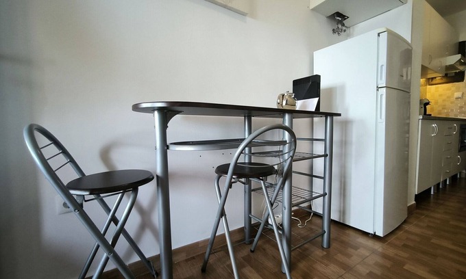 This charming one-bedroom apartment offers breathtaking ocean views from its spacious terrace, located in the heart of the city directly across from the fishing pier. Located on the 6th floor of a building with an elevator, this compact accomodation is perfect for a relaxing vacation. The apartment includes a bedroom with double bed and a wardrobe, a well-equipped modern kitchen for preparing meals, and a bathroom featuring a shower, also including a washing machine. While there is no living room, the terrace includes a cozy covered area with comfortable outdoor furniture and a TV, making it an ideal spot to unwind.