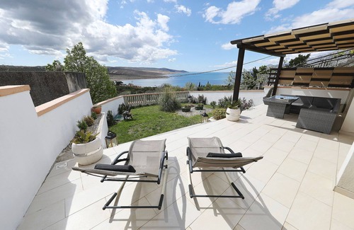 Family-friendly apartment with sea views can be found in the house Marina in the quiet resort of Rovanjska on the Adriatic coast near the Paklenica National Park. The 45 sqm large 2-room apartment with large south - terrace and children's play area for up to 5 people is located on the ground floor. The tastefully decorated apartment has a triple bedroom (double bed + single bed) a kitchen with sofa bed, a shower room and a large partially covered furnished terrace with umbrella and loungers with great views of the sea. The apartment also has a fully equipped kitchen with ceramic hob, oven, dishwasher, microwave, Filterkaffeaparat and kettle and a satellite LCD TV with German channels. Cot and high chair can also be provided. Furthermore, the apartment has a free air conditioning and Wifi Internet. Washing machine is available in the shower room. Of course, parking facilities are available at the house and an outdoor grill. The long, child-friendly pebble beach is 400 meters away.