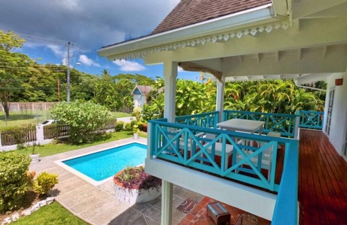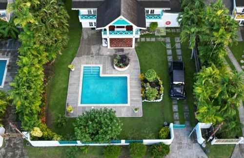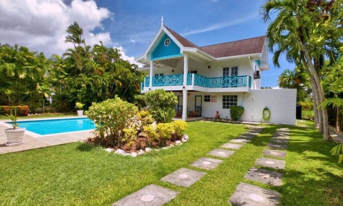 The interior is designed with comfort in mind, with high vaulted ceilings, rich wood furnishings, and local artwork, creating an authentic Caribbean ambiance. The master bedrooms are spacious and feature en-suite bathrooms, and the fully equipped kitchen is perfect for whipping up a delicious meal. Outside, you'll find a well-manicured tropical garden and a private swimming pool, ideal for relaxing and soaking up the sun. This villa is the perfect vacation destination for those seeking a luxurious and authentic Caribbean experience. Book now and get ready to indulge in the ultimate tropical getaway.
