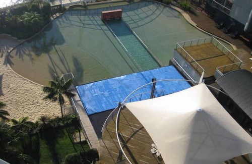 Living area and bedrooms open to a large balcony, with outdoor setting and bbq, overlooking beach lagoon and heated pool.