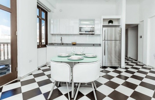 As soon as you enter the flat you are welcomed by an open concept layout encompassing the kitchen, dining room, and living room. The high ceilings are an iconic design feature of the colonial architecture Old San Juan is famous for.