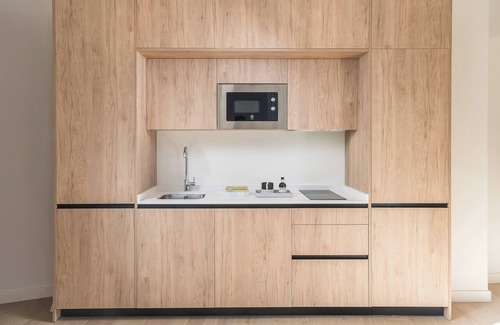 The apartment features a cozy living area with modern furnishings, large windows that let in plenty of natural light, and a dining space perfect for enjoying meals. The open-plan kitchen is fully equipped with high-end appliances, making it easy to prepare meals during your stay. The tranquil bedroom, decorated with soft linens and elegant touches, provides a peaceful retreat, while the sleek bathroom offers a walk-in shower and high-quality finishes.
