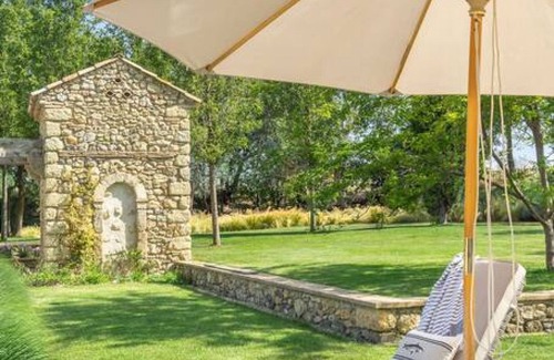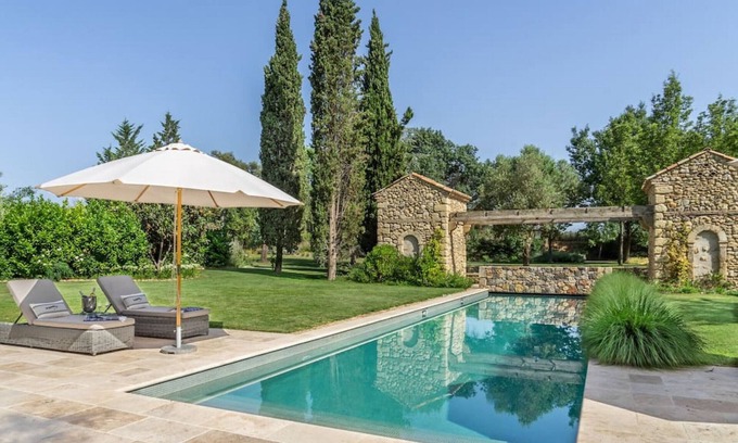 Dans le jardin, des pins parasols centenaires, des rosiers, des cyprès, des lavandes habillent la pelouse vallonnée ainsi que sa piscine de 17 mètres. La piscine est bordée d'une terrasse avec de confortables transats, des parasols pour profiter des après-midis d'été.