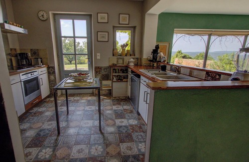 A kitchen overlooking the dining room, with beautiful windows overlooking the garden