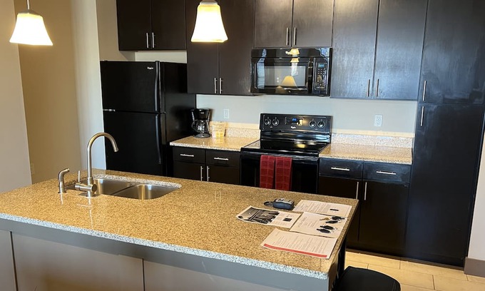 Beautifully furnished 2 bedroom 2 baths apartment on the 3rd floor with elevator access, plenty of parking, Roku TV and more! Show up and unpack. Turn-key ready! 1200 Square feet of living space, more than a hotel!