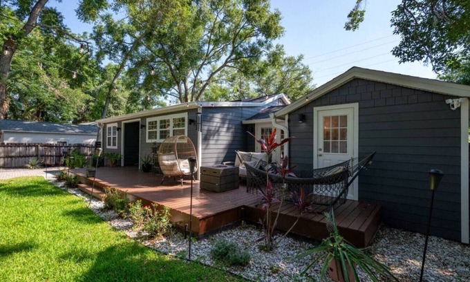Experience a stylish and modern retreat just 8 minutes from downtown Orlando. This thoughtfully designed space offers a private entrance, self-check-in, and is ideal for extended stays or vacations. Enjoy high-speed Wi-Fi, a king bed, in-suite laundry, and a fully stocked kitchen. Relax in the fenced backyard with a patio, fire pit, and hammock. Includes free parking, Netflix, and family-friendly amenities like a Pack-N-Play and highchair.