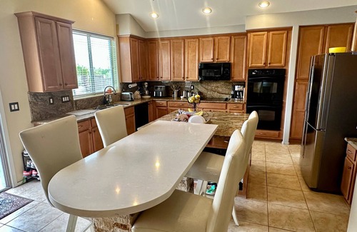 Enjoy your stay at this quiet, comfy and spacious home with a huge kitchen, double oven, play room, private heated pool, hot tub, and trampoline. Venture out to nearby shopping, hiking trails. Close to Ben Avery Shooting Range, TSMC and Lake Pleasant and some of the best golf courses in the country.