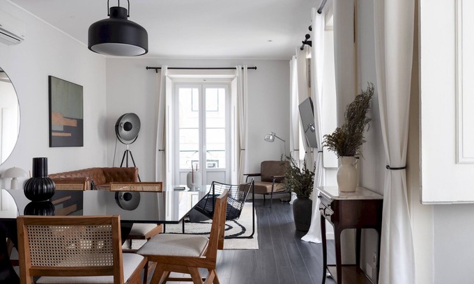 Discover the heart of Lisbon from our spacious 180 m2 apartment, comfortably accommodating up to six guests and boasting a private outdoor terrace. Set on the vibrant 'Rua do Diario de Noticias', the building captures the neighborhood's unique charm with its modest height and street-level commercial spaces.