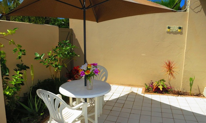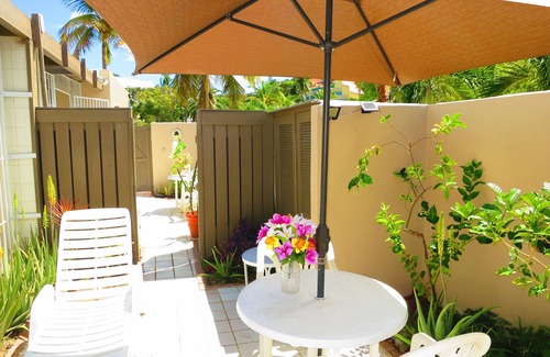 Master Garden Bedroom, #3011, measuring 18' x 16', features a king bed, love seat sofa and bath. It is equipped with a microwave oven, coffee maker, blender, refrigerator, dish/glass/flatware, CC flat screen TV, ceiling fan, AC, iron, ironing board, and a private, 16' x 15' walled-in garden patio with outdoor furniture and free WIFI.