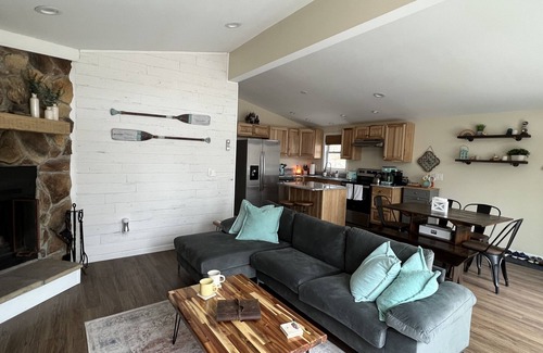 With three bedrooms—two with queen beds and one designed for kids with bunk beds—the home comfortably sleeps 8 guests. The full bath with a shower/tub combo in the main hall and a convenient half bath attached to the primary bedroom provide practical amenities for everyone's comfort.