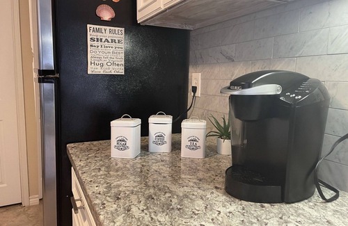 Kitchen is spacious and is equipped to cook and serve up to 8 ppl. There is a keurig to enjoy your favorite flavor of coffee! The living area has a sofa with a pullout bed and two single sofa to make a conversation set.