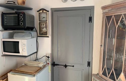 living room with large fireplace TV and radio, shower room with WC, kitchen with fridge and microwave. Upstairs, a large bedroom with a superb view of the hinterland. In front of the Mazet, a beautiful sunny terrace