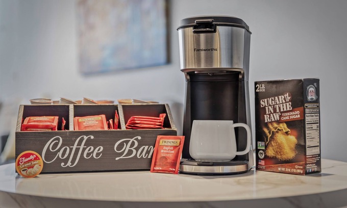 Coffee Machine w/ Pods, Kettle & Tea Bags Provided