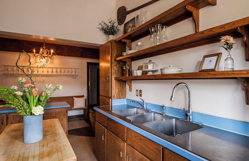 Filled with beautiful antiques, the lodge features a cavernous yet cozy living room for lounging around, a family-style dining room for feasting, an industrial kitchen, seven bedrooms with seven ensuite bathrooms, while the property offers a multi-level deck, outdoor hot tubs, and a hiking trail.