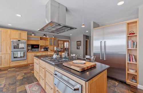 • Gourmet Kitchen—Designed for culinary enthusiasts, the fully equipped kitchen features Thermador appliances, dual ovens, a spacious layout, a dedicated coffee bar, and ample counter space, making meal preparation effortless for large groups.