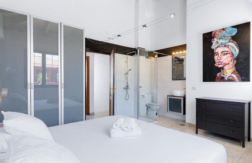 A 7-minute walk from La Pelada in El Médano, MEDANO4YOU The Palm Tree Holiday Home provides accommodations with access to a solarium. This property offers access to a terrace, free private parking, and free Wifi. The villa offers an outdoor swimming pool, hot tub, and luggage storage space. This villa includes 5 bedrooms, a living room and a flat-screen TV, an equipped kitchen with a dining area, and 3 bathrooms with a hot tub and a washing machine. Towels and bed linen are featured in the villa. The property has an outdoor dining area. There is a garden with a barbecue at this property, and guests can go cycling nearby. Golf del Sur Golf Course is 8.6 miles from the villa, while Aqualand is 15 miles from the property. Tenerife South Airport is 3.7 miles away, and the property offers a paid airport shuttle service.