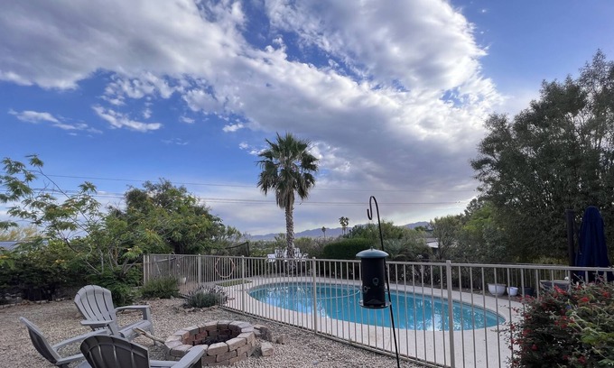The backyard is a showstopper. Positioned on a coveted Tucson hilltop, there's total privacy (no neighbors looking in!) as you take a dip in the pool or grill out in the lounge area. You'll also enjoy mountain views of both the Tucson mountains (backyard/kitchen) and Catalina mountains (front porch/dining).