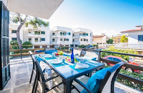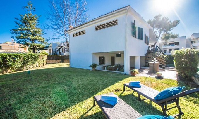 In the heart of Puerto Alcudia, just 200 meters from the beach, this charming holiday home offers a peaceful and inviting escape for up to 8 guests. The private fenced garden, framed by tiled flooring and lush greenery, features cozy outdoor seating, sun loungers, and a dining table for 8—ideal for al fresco meals or lazy afternoons in the sun. A decorative Mallorcan well adds a traditional touch, creating a serene setting for family gatherings or relaxed moments with friends. Inside, the bright and modern interior includes a spacious living room with two sofas, satellite TV, and direct access to the garden. The fully equipped kitchen also opens to the outdoors, perfect for enjoying breakfast in the fresh air. The ground floor offers two bedrooms (one double, one with twin beds) and a full bathroom with a bathtub. Upstairs, you’ll find two more twin bedrooms and another bathroom, with one bedroom opening onto a private terrace for a quiet escape. Ideally situated near local shops, cafés, and restaurants, this home places you close to everything Alcudia has to offer. The bustling port area is just 2.5 km away, while the historic old town of Alcudia—famous for its market and medieval charm—is only 3.5 km from your door. Whether you're exploring the island or enjoying the comfort of your own space, this home is your perfect base for a memorable Mallorca holiday.