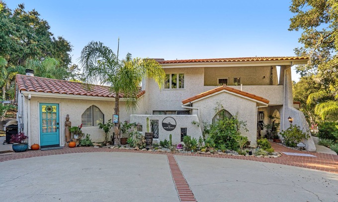 Set on three acres of magical sacred land, this estate provides roughly 4,000 square feet of relaxed, Malibu boho-chic living space. The real crown jewel is the resort-style outdoor entertaining paradise surrounded by lush landscapes and breathtaking views. There is an outdoor pool with an attached pool spa, an infinity Zen yoga deck with mats and blocks for morning practice, Mediterranean patios with Positano Italian benches plus several outdoor dining areas (over three dozen exterior dining chairs are provided for large groups), a large deck with twinkling string lights and a Ping-Pong table, two grilling areas, and an extensive lawn with a hammock.