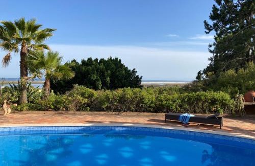 Meia Lua - Your Private Artsy Paradise Overlooking the Ria Formosa with pool and sea views near Barril beach, Tavira is a recently renovated villa in Luz de Tavira where guests can make the most of its pool with a view, spa and wellness center, and garden. This property offers access to a balcony, free private parking, and free Wifi. The accommodation provides airport transfers, while a bicycle rental service is also available. Providing a terrace and sea views, the spacious villa includes 5 bedrooms, 2 living rooms, flat-screen TV, an equipped kitchen, and 4 bathrooms with a bidet and a bath. Towels and bed linen are provided in the villa. There's also a seating area and a fireplace. During warmer months, you can make use of the barbecue facilities and eat on the private patio. The villa offers a variety of wellness options, including a sauna, a hot tub, and yoga classes. Fitness classes are available at the property. Guests can also warm up near the outdoor fireplace after a day of cycling. Tavira Island Beach is a 14-minute walk from the villa, while Tavira Island is 4.2 miles away. Faro Airport is 21 miles from the property.