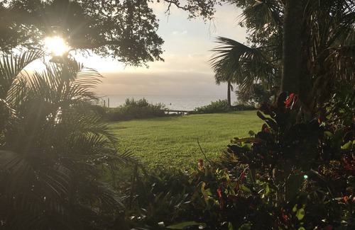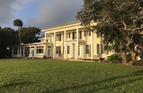 Watch the sunrise in this charming two bed, two bath upstairs suite overlooking the Indian River Lagoon. Featuring two king bedrooms, a spacious living area, two bathrooms, fully stocked kitchen and more. The Ballard Estate is a historic, century old, riverfront home situated in a quiet neighborhood with breathtaking views. Access to our private docks, outdoor living areas, kayaks and a garden gazebo means you won’t need to venture off the property to take in all the natural beauty this area has to offer. Must use stairs to access suite. No elevator on site.