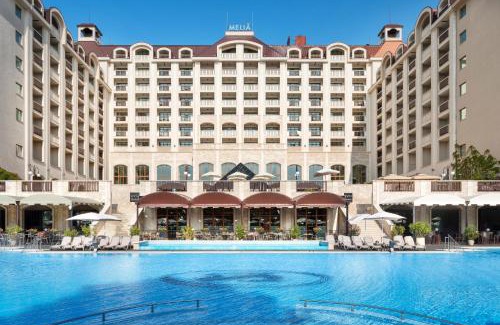 The luxurious Melia Grand Hermitage on a quiet hillside is only 328 feet away from the beach and is within easy reach of the center of the Golden Sands resort. All rooms offer free WiFi access. The spa stretches over 2 levels and offers beauty and massage treatments, an indoor and outdoor pool, a hot tub, a sauna, a Turkish bath and a gym. Each room features a private and spacious balcony with a magnificent view over the sea, the swimming pool, the surrounding parks or the forested hills. Bathrooms feature a bath and a shower cabin that is spacious enough for 2. Fine Bulgarian and international cuisine is served in the Melia's restaurants and a range of pubs and cafés invite you to spend a relaxing time while sipping your favorite drink. North of the Melia Grand Hermitage there is a lush green park and on the east, there are green terraces, leading down to the promenade and the private beach. 2 sun lounges and 1 parasol are provided upon availability during the summer season, free of charge. Transfers from and to Varna, Burgas and Sofia airports are available on request and at an additional cost. The center of Golden Sands Sea Resort is set 328 feet away from Melia Grand Hermitage. The BlackSea Rama, the Tracian Cliffs and the Lighthouse Golf Courses can be reached within a 30-minute drive.