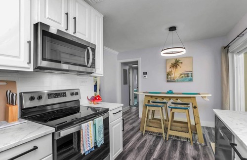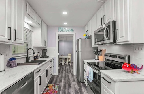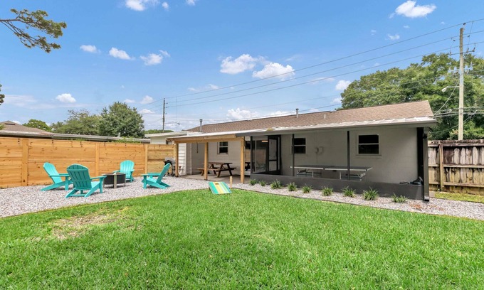 Memorial House, is an fun, beachy Short-Term Rental (STR) that includes 2 queen bedrooms and a third bedroom with 2 twin beds, 1 full bathroom, and a bonus/game room with a futon, only 2 miles to the beach and downtown! Most baby items and cooking amenities provided. Pet-friendly with a fenced in backyard, grill and fire pit. TVs in every room. Enjoy ping-pong, arcade games, and a fire pit. Jet Park, pickle and basketball courts, beach, and local water parks are a hop, skip and a jump away!