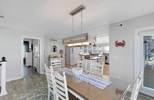 An open and spacious Great Room features a living area with flat-screen TV. The kitchen has new appliances and is stocked with plenty of equipment for making family meals. The kitchen island seats 4 and there are two dining areas: one as a breakfast table (seats 4) and the other for dining table seats 6. A half bathroom is located by the kitchen. The King Master Suite has a flat-screen TV (streaming TV only), deck access and its bathroom has a separate shower and garden tub. Sun decks face both east and west with a screened porch on the west side of the house that has Nags Head Hammocks' furniture. [Note: gas fireplace is not available for guest use.]