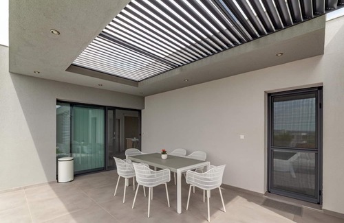 The fully furnished pergola and the private garden offer a wonderful view of the Aegean sea and the green olive gardens.