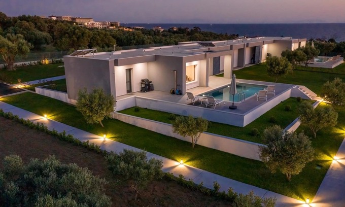 MERELIA Luxury Villas are situated amidst an olive grove and open their doors onto the tranquil magic of the bay. The location provides wonderful views of the Aegean Sea, while surrounded by the lush olive grove and Mediterranean style gardens.