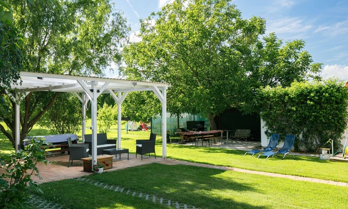 Balatonkeresztùr 20 km from Keszthely: Modern 2-family house "Meretei Porta", detached, renovated in 2022. 1.5 km from the centre of Balatonkeresztur, in a quiet, sunny position, 2 km from the lake, 2 km from the beach. For shared use: garden 500 m2 (fenced), meadow. Garden furniture. In the house: air conditioning, washing machine. Parking (for 2 cars) on the premises. Shop 700 m, restaurant 800 m, grass beach 1.5 km, thermal baths "Hévíz" 25 km, lake Lake Balaton 1.5 km. Tennis 8 km, riding stable 28 km, children's playground 1 km. Nearby attractions: Festetics Castle 20 km, Bobo Fun Park 25 km, Adventure Park Zamárdi 63 km, Festetics Zoo, game farm 26 km, Kereki Dinosaur Park 54 km, Kis-Balaton Visitor Centre 13 km. Please note: Loading and unloading of baggage is possible at the holiday house.