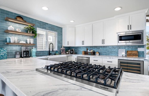 Three additional bedrooms keep guests relaxed and comfortable. One guest room has a queen bed and access to a hallway bathroom with single vanity, shower, and sliding doors to the backyard. Another features a queen-sized bed and an attached bathroom with a single vanity and a tub/shower combo. The third is perfect for younger guests, with a twin-over-full bunk bed, twin trundle, and shared bathroom access.