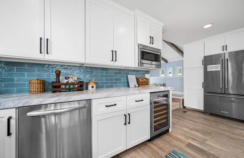 Recently updated, the Mermaid Cottage is designed for ultimate comfort and relaxation. The second-floor great room is the heart of the home – a 75” television with soundbar makes it the perfect spot for movie night, with enough seating for the whole family and soaring vaulted ceilings with exposed beams. Just off the great room is a patio overlooking the backyard with bistro seating for two – a peaceful spot for your morning coffee or evening cocktail.