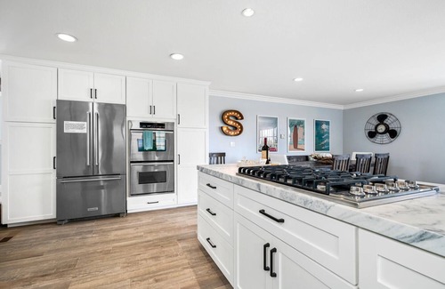 The great room flows into the kitchen and dining area, creating an ideal open-concept space for entertaining. The gourmet kitchen features granite countertops, Viking gas cooktop, double ovens, French door refrigerator, and dishwasher—fully stocked for all your culinary needs. Planning dinner with friends? Chill your bottle of Rosé in the wine fridge for the perfect temp.