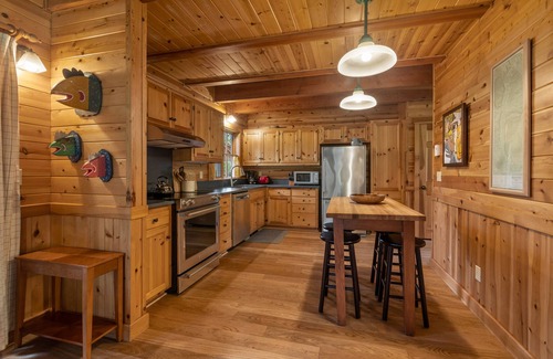The main level features a well-equipped kitchen with new appliances and supplies cooks will love. A comfortable leather couch, easy chair and bent wood rocking chair surround the river rock fireplace. To keep you entertained and connected, the cabin has satellite TV, CD and DVD players, and wireless internet. There is an extensive library of books for all ages and plenty of games, puzzles, and arts and crafts supplies to engage the entire family. And, don’t forget the hiking, fishing, skiing….