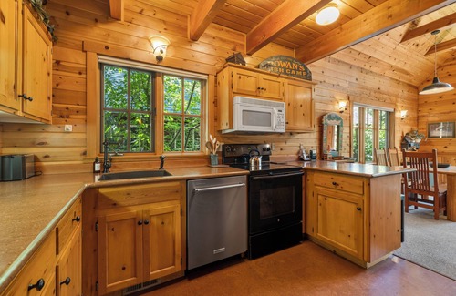 The unique layout and amenities of Cabin Three accommodates families and couples especially well. The spacious loft upstairs features king bed and plenty of room to spread out.