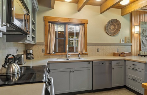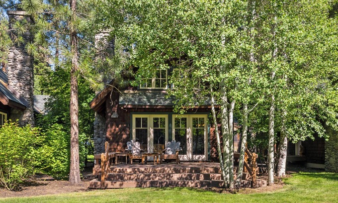 Features include a stone fireplace, CD player with a small CD collection, and a fully equipped kitchen. End the perfect day with a nice glass of wine on our deck that overlooks a lush lawn area, Ponderosa pines, and of course, an incredible view of the river.