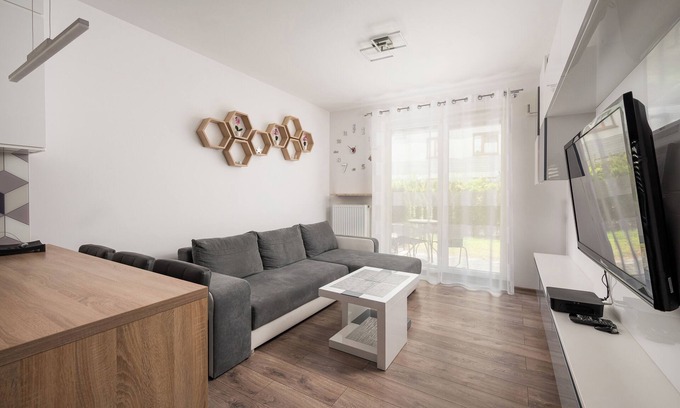 Metro Bemowo Apartment with Garden is a cozy apartment that features a living room with a sofa bed and a kitchenette, a bedroom with a comfortable double bed, a bathroom, and a spacious garden where guests can relax and enjoy their morning coffee or an evening glass of wine. Guests have access to various amenities, including free WiFi, cable TV, a washing machine, an iron, a hairdryer, a dishwasher, an oven, a refrigerator with a freezer, and kitchen accessories. There is also a parking space in the underground garage available for guests.