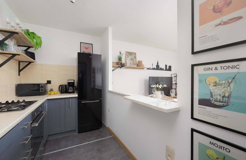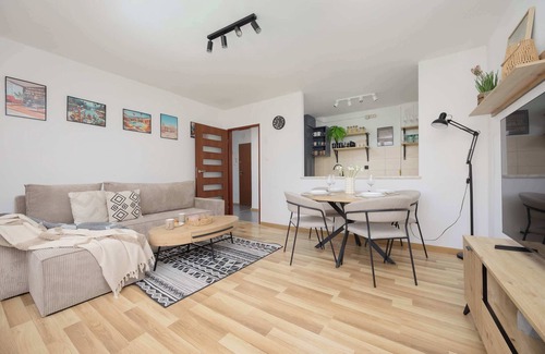 This functional and efficiently arranged 49 m² apartment, located on the 5th floor of a building with a lift, is ideal for up to six guests – a family or a group of friends looking for a comfortable base in Warsaw. The bright, spacious living room invites you to spend time together. It features a sofa bed, providing a comfortable sleeping space for two people, as well as a modern Smart TV with cable access, perfect for evening relaxation. The large dining table with chairs is the perfect place for shared meals and conversations. The living room opens onto a furnished balcony, offering a pleasant place for morning coffee. The kitchenette is fully equipped to allow you to prepare meals with ease. Guests have access to a gas stove, fridge with freezer, oven, toaster, drip coffee maker, electric kettle and microwave. The apartment offers two comfortable bedrooms. Each has a comfortable double bed, ensuring a good night's sleep. Both bedrooms are equipped with wardrobes, providing ample storage space. The modern bathroom with shower, sink, mirror and hairdryer ensures complete comfort. A welcome set of cosmetics and fresh towels ensure a pleasant start to your stay. For your convenience, the apartment provides fast Wi-Fi and access to Smart TV, allowing for trouble-free remote work or entertainment. The apartment's bright and cosy interior design creates a uniquely warm and relaxing atmosphere, conducive to unwinding after an eventful day. Pets are accepted for an additional fee, making this apartment a pet-friendly choice for travellers with pets.