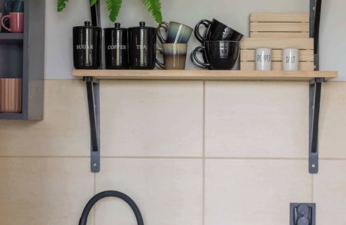 Gas stove, fridge with freezer, oven, toaster, coffee maker (drip), electric kettle, microwave, kitchen and tableware