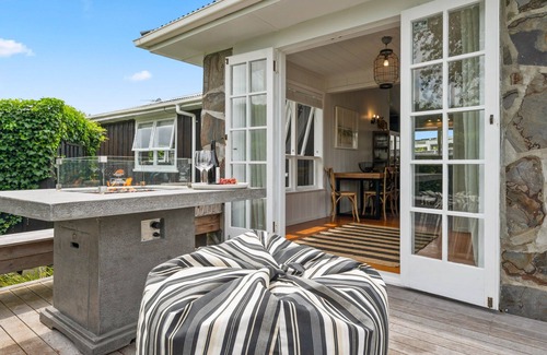 French doors expand the space onto the timber decking. Gather around the stylish fire-pit with some nibbles! Enjoy this peaceful setting in your private, well-tended backyard.