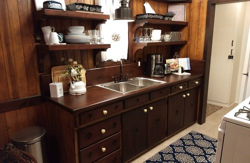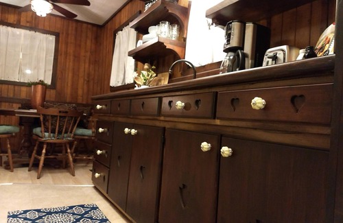 We've poured a lot of love into this cabin during an entire year of remodeling. In the kitchen, we hand-crafted entirely new cabinets, countertops, and open-shelving from raw sheets of sugar pine. Each piece was routed and hand-carved like they probably did a hundred years ago.