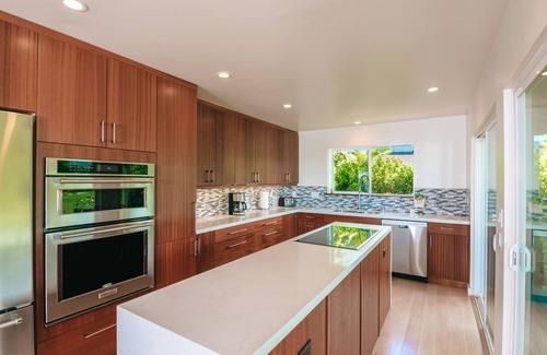 Our spacious remodeled vacation home has amazing ocean, Bali Hai and golf course views and now boasts updated modern bathrooms with Hans Grohe rain showers and fixtures plus a free-standing tub in the master bathroom, state of the art kitchen with Caesarstone counters and Kitchen Aid appliances, all new windows and doors, 8 foot tall sliders leading to the rear lanai, two covered outdoor lanais for dining and unwinding, wall to wall hardwood flooring, wood patio decking, midcentury modern furnishings and an enclosed covered garage. Each room including the lanai is equipped with Big Ass fans, considered the most efficient and quietest fans on the market.