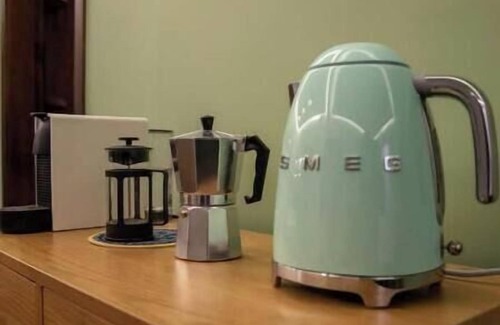 - Coffee corner with a Nespresso machine and pods, Moka pot, French press, and a Smeg kettle.