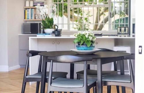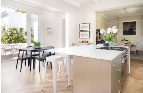 The villa has a fully equipped kitchen, laundry, a dining area, and a lounge with a flat-screen TV. The house is tastefully furnished with a combination of Cape antique and contemporary designed furniture and art, and decorated in soft and natural tones.