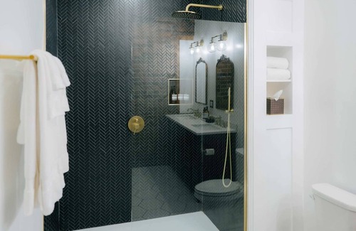 This boutique experience at the Midnight on Main Suite includes an oversized luxurious shower, local bath amenities, double vanity, mini-fridge, curated local coffee experience, SmartTV (complimentary Netflix), along with a king bed featuring premium bedding and luxe mattress.